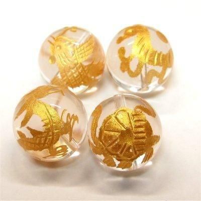 《風水縁起物》神獣彫刻ビーズ4種セット(水晶金入り)四神獣 (14mmX4個)